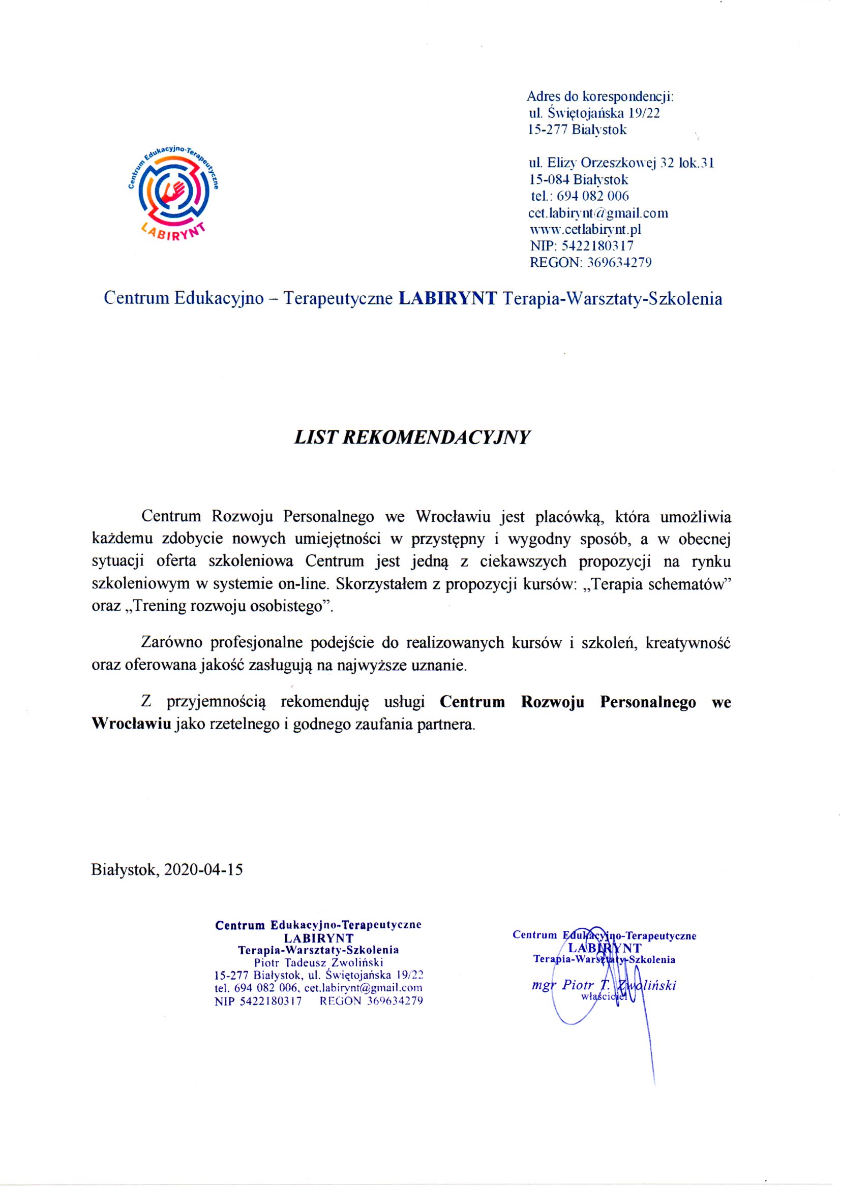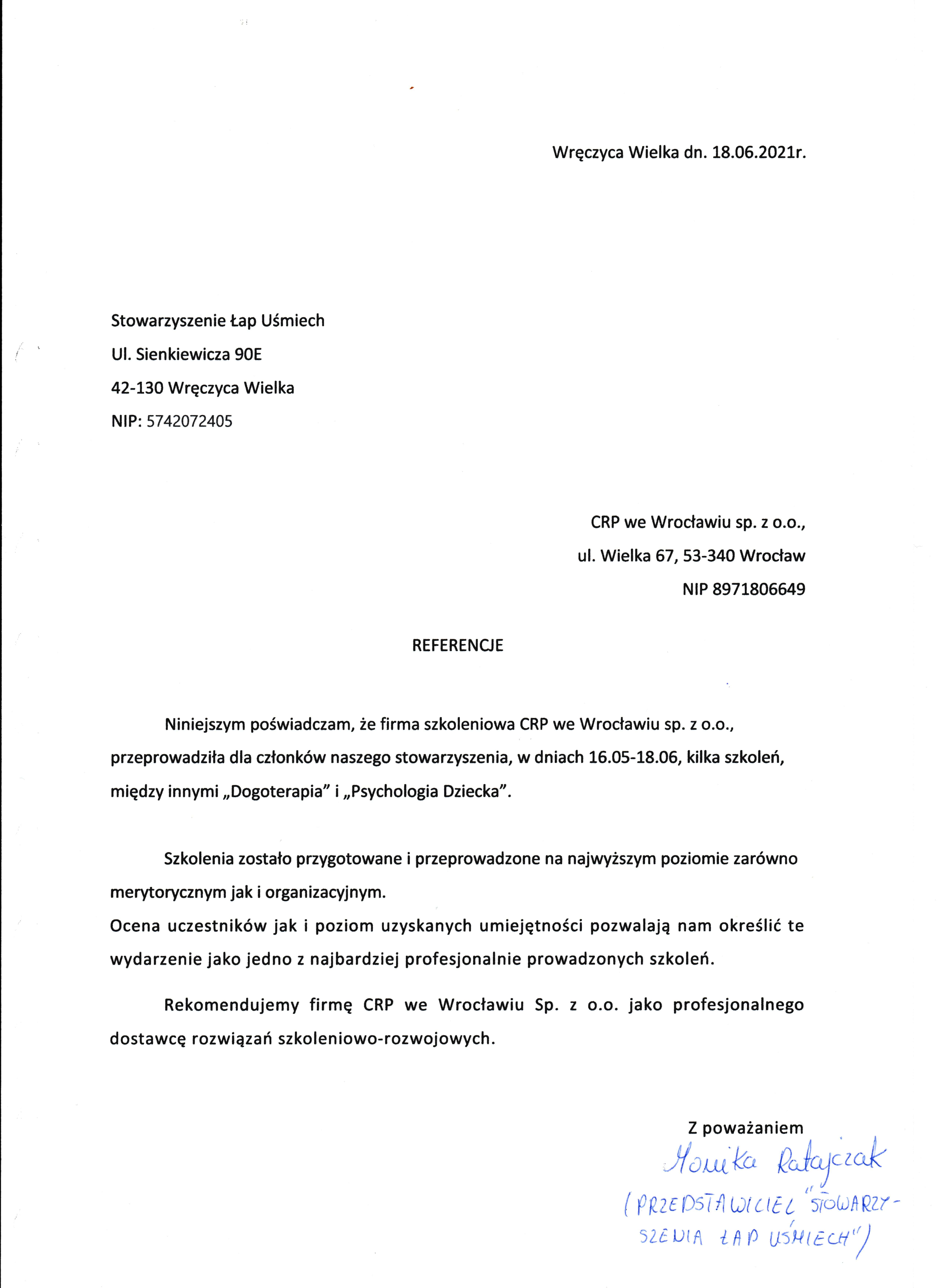 Od 2021 r. jesteśmy wpisani do Rejestru Instytucji Szkoleniowych, prowadzonego przez Dolnośląski Wojewódzki Urząd Pracy, dzięki czemu można skorzystać z naszych usług za pośrednictwem wspominanego Urzędu na zasadzie refundacji kosztów szkolenia.